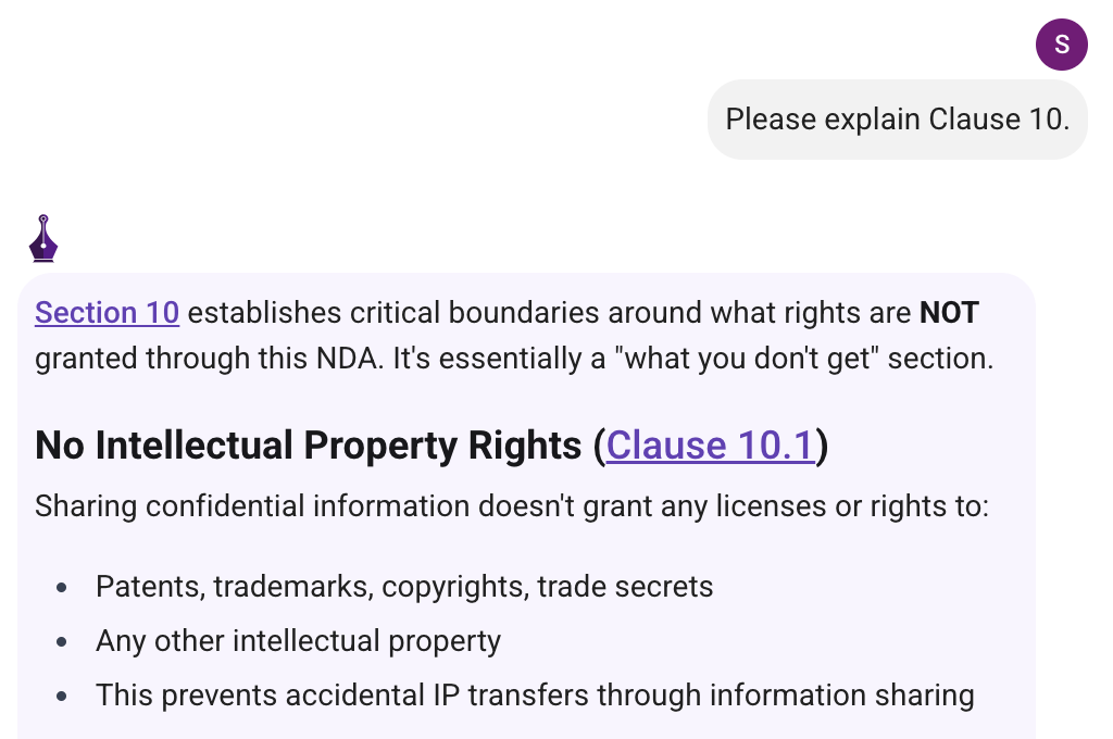 Whether you need a quick summary or want clarity on a specific clause, Genie gives you instant, plain-language answers. Get a clear view of what the contract says, what it means for your business, and what to watch out for without needing a legal background.