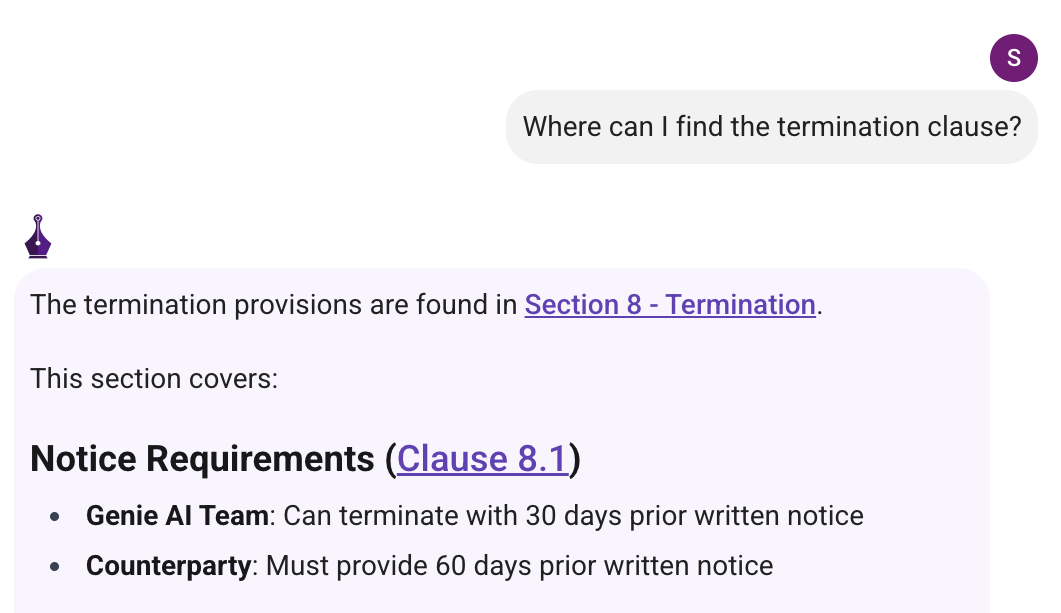 Ask questions like “Who’s liable?” or “What happens if this is terminated early?” - Genie answers in seconds.